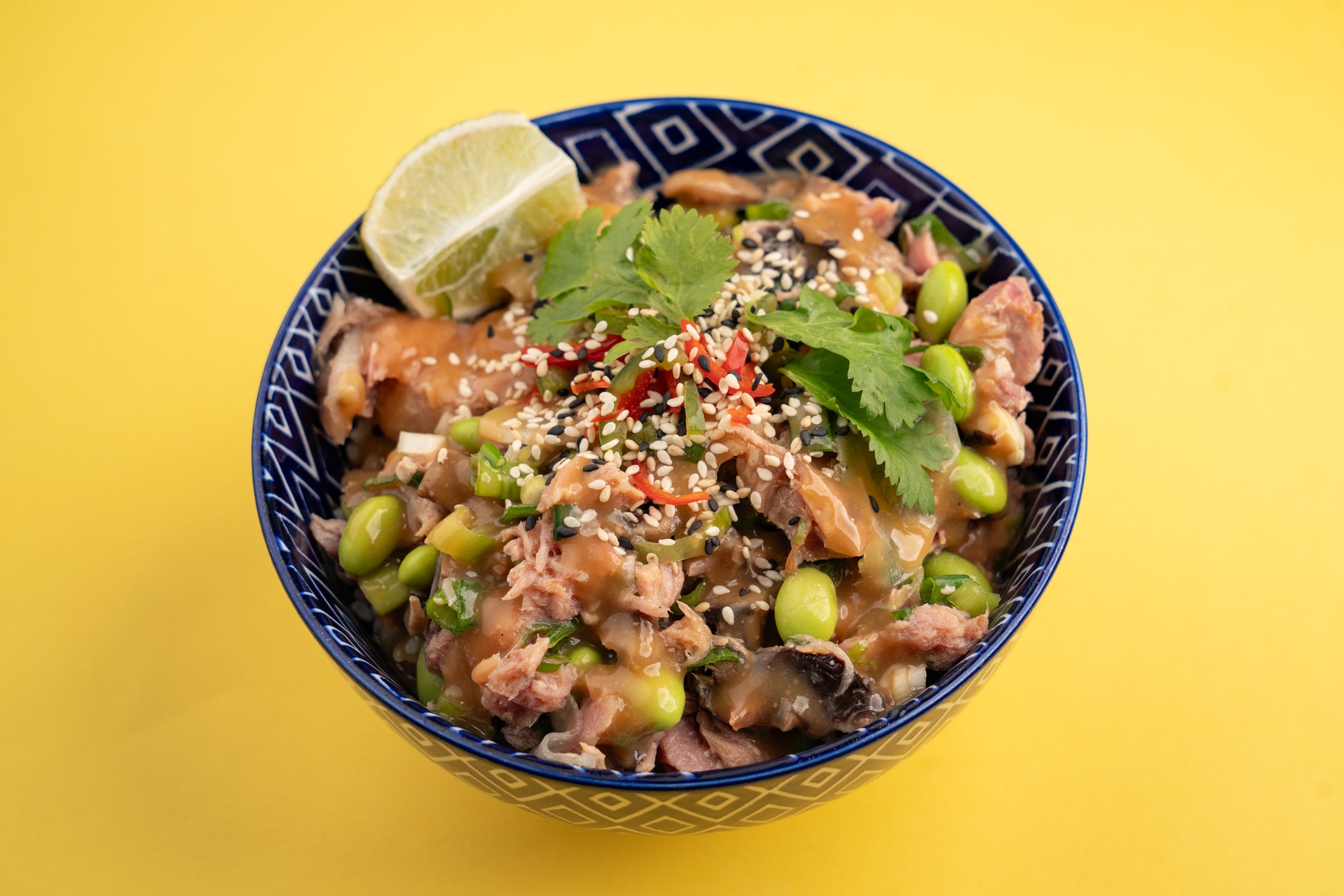 Bowl with sushi rice, tuna cooked in oil , yuzu marinade , daikon , pickled shiitake mushrooms, edamame, spring onions, miso salsa, chilli peppers and coriander.