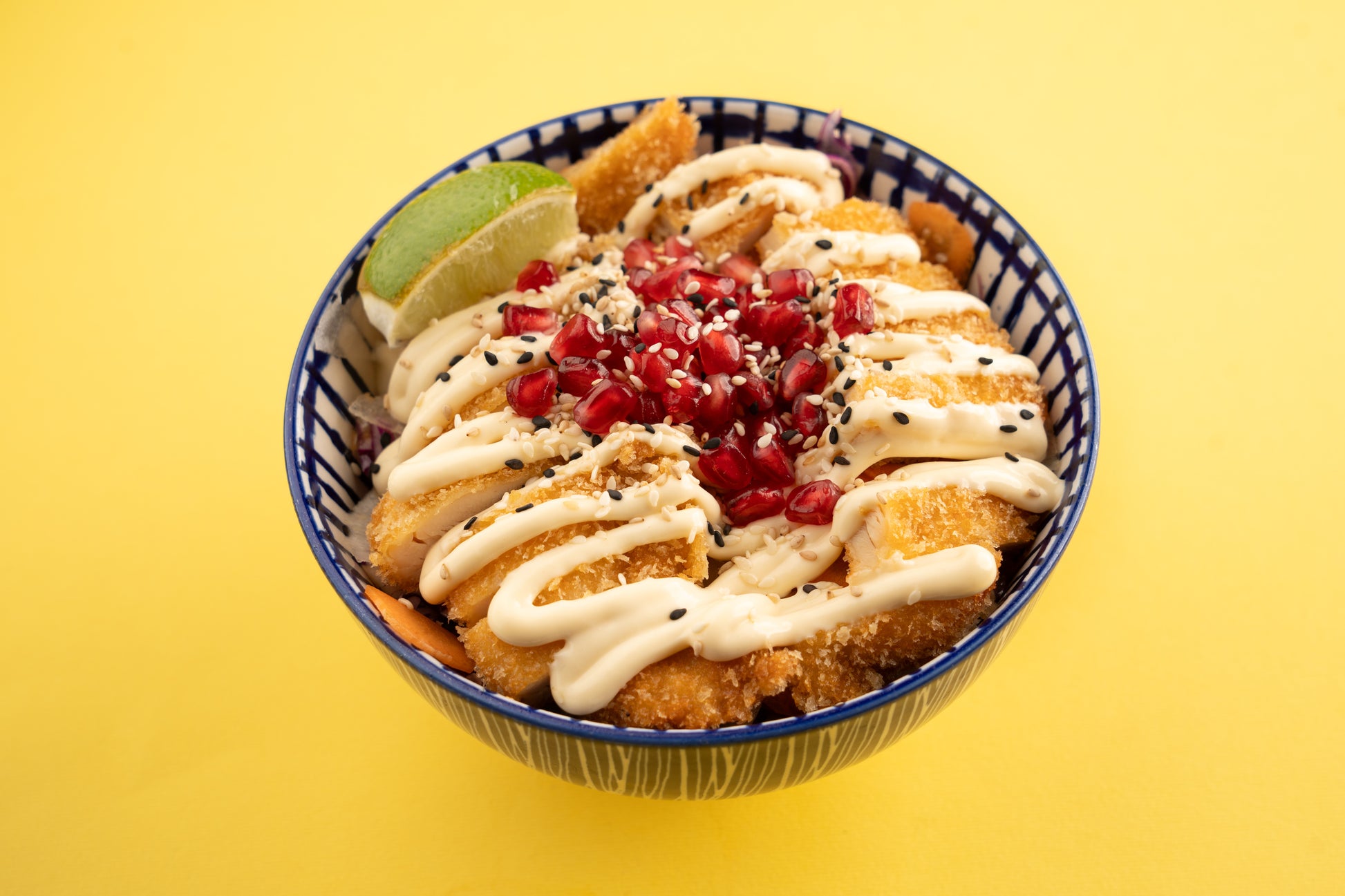 Bowl with sushi rice, panko breadcrumbs fried chicken breast, shoyu sesame marinade, carrots, daikon, japanese coleslaw salad, pomegranate, lime mayo, sesame.