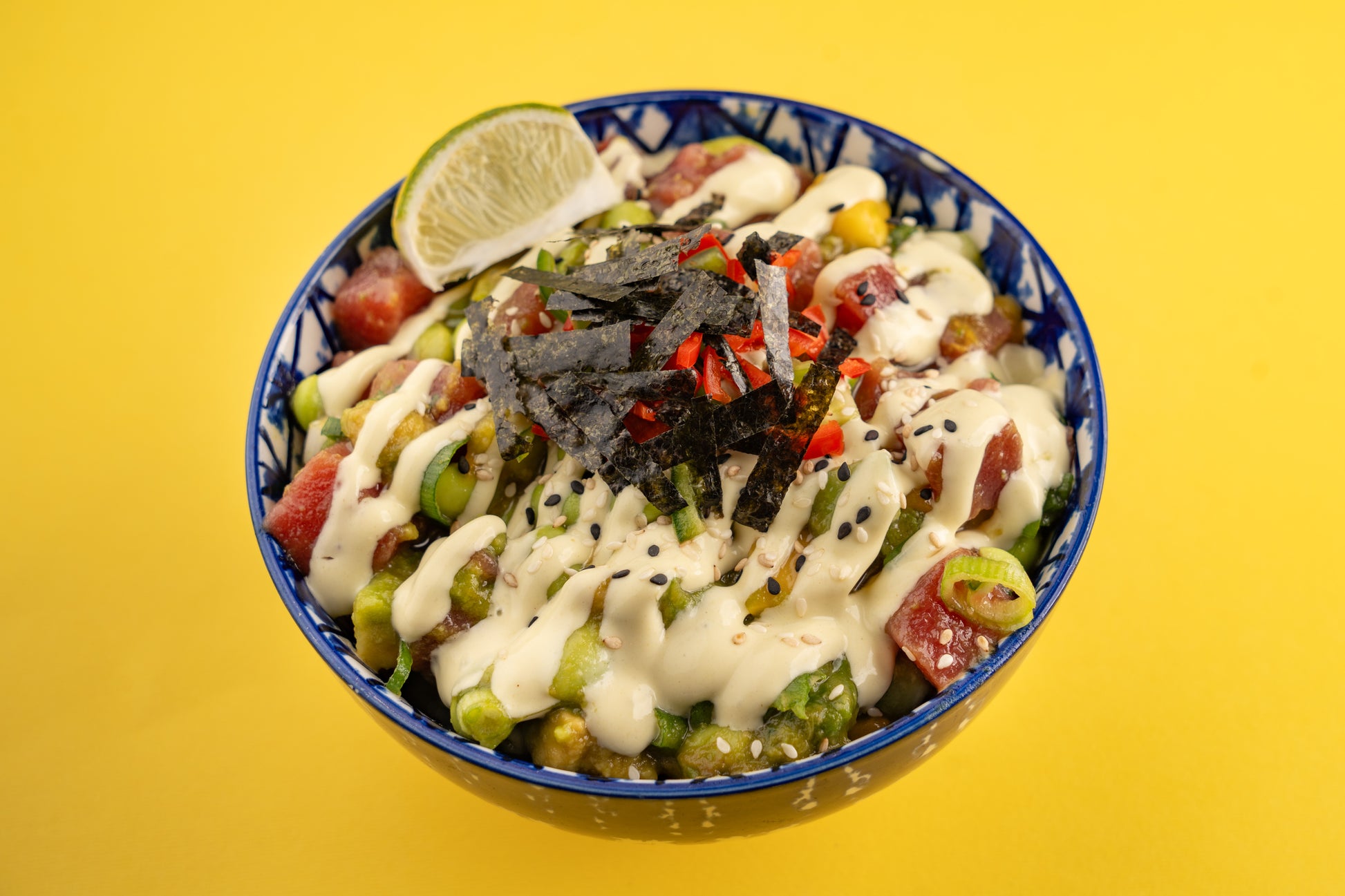 Bowl with sushi rice, tuna, poke marinade and mango salsa, avocado, mango, cucumber, spring onion, edamame, wasabi mayo , chilli peppers , nori algae, sesame.