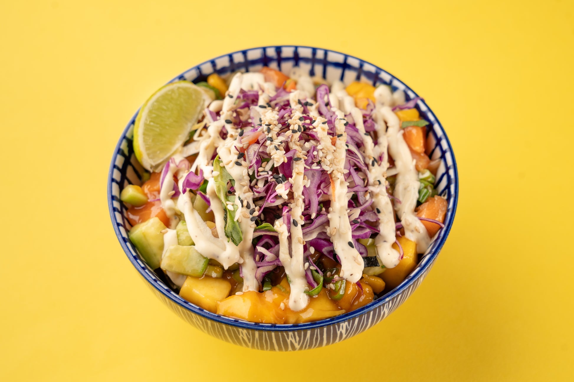 Bowl with sushi rice, salmon, teriyaki sauce, cucumbers, spring onions, mango, japanese coleslaw salad, edamame, truffle mayo and sesame.